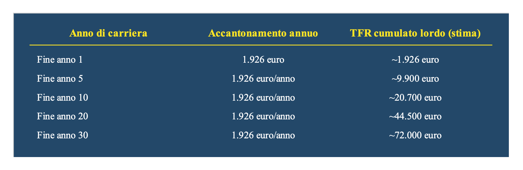 Un lavoratore con RAL di € 34.000 accumula ogni anno circa € 2.516 di TFR.